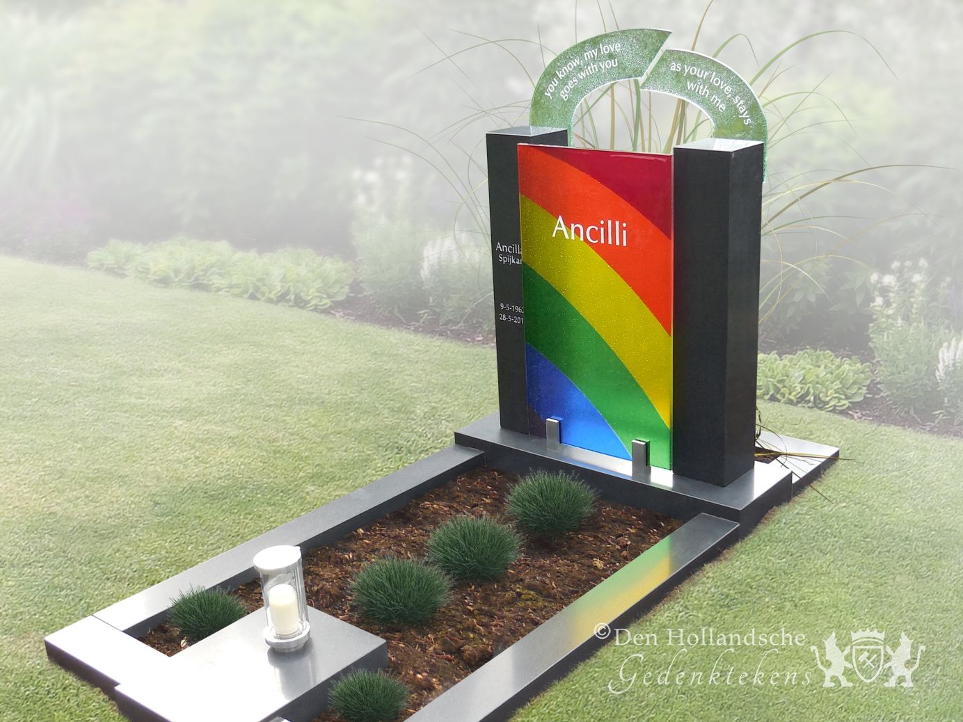 De grafsteen bevat de basiskleuren van een regenboog en brengt daarom veel kleur met zich mee. Het zonlicht zorgt ervoor dat de grafsteen nooit hetzelfde oogt. Het opschrift kan zowel op de zuilen als op het glas worden aangebracht.Enkele grafmonumente... lees meer >