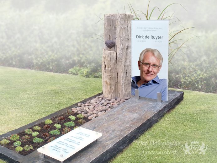 Modern glazen grafmonument met ruwe steensoorten
